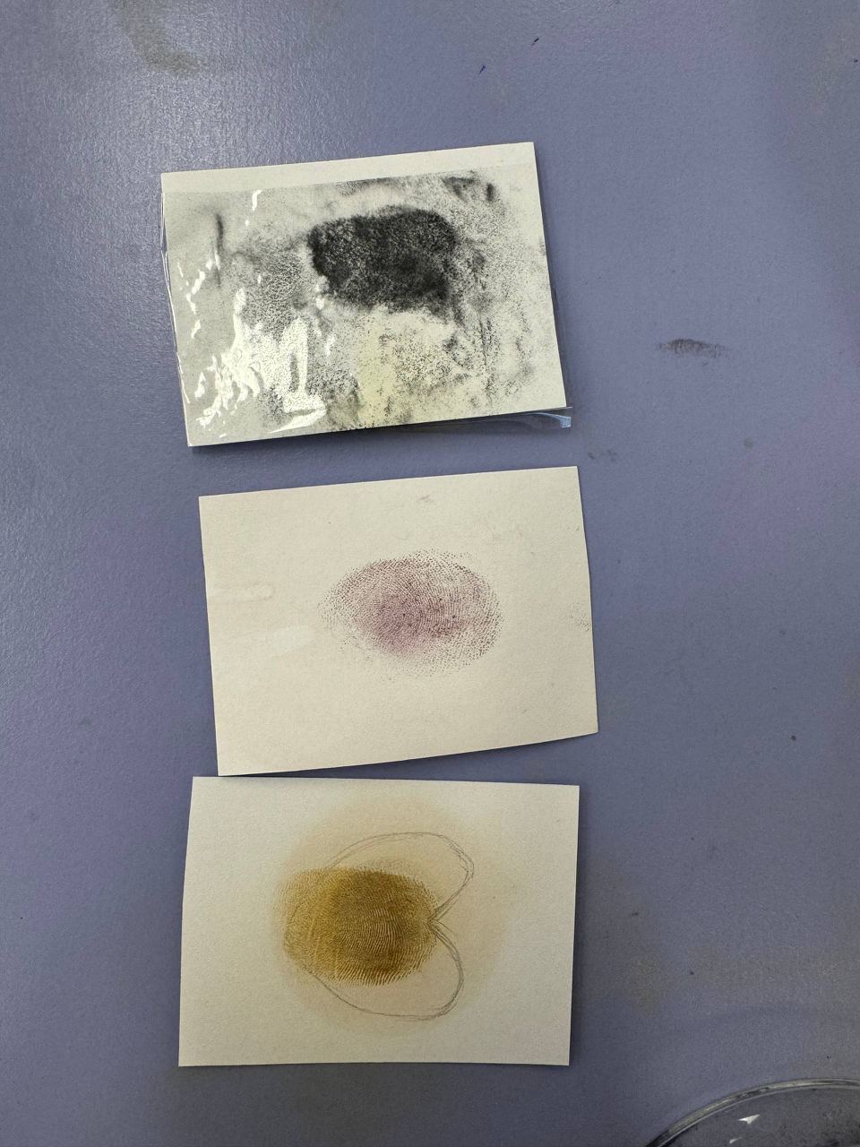 Ребята познакомились с историей развития метода проявления отпечатков пальцев в мире и в России, обсудили его правовые аспекты и области применения. А затем перешли к практике и попробовали три метода проявления отпечатков: